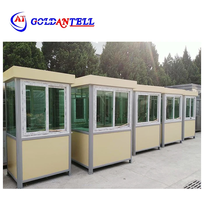 Структура этого киоска билетов является интегральной, что означает, что он очень прочный и долговечный.что гарантирует его устойчивость к погодным условиям и долговечностьРазмер охранного дома составляет 150*150*250 см, но его можно настроить в соответствии с требованиями заказчика.
